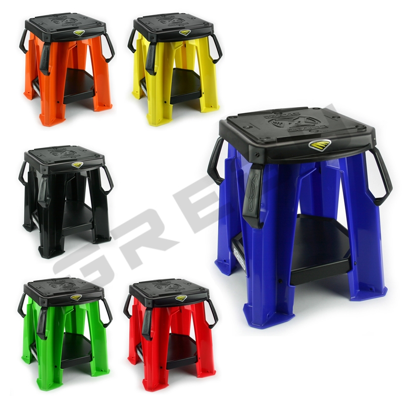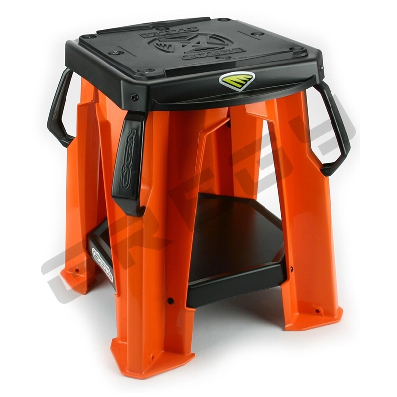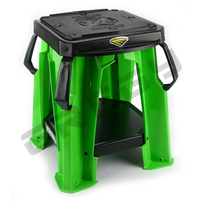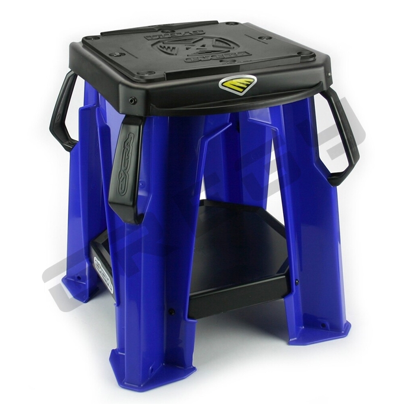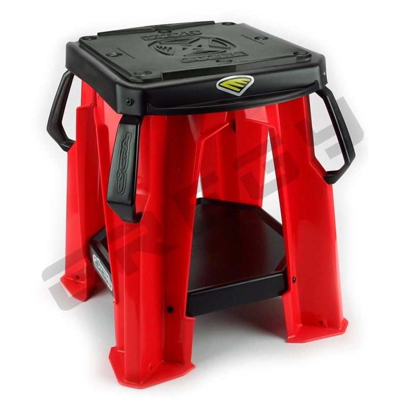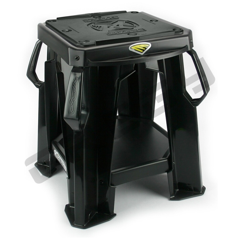Pevný stojan Cycra s vymeniteľnou gumovou podložkou. Veľká spodná a malé bočné plochy slúžia na odkladanie dielov počas servisu motocykla. Veľmi silná, pevná a zároveň ľahká plastová konštrukcia. Nosnosť: 220kg